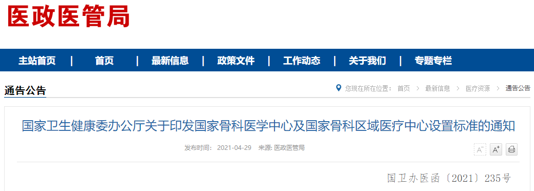 2021年4月29日,國家衛(wèi)健委醫(yī)政醫(yī)管局新發(fā)布了一則《關(guān)于印發(fā)國家骨科醫(yī)學中心及國家骨科區(qū)域醫(yī)療中心設置標準的通知》,標準中,除了對于骨科醫(yī)學中心的硬件要求之外,更是對所需的醫(yī)療設備標準進行了公布。