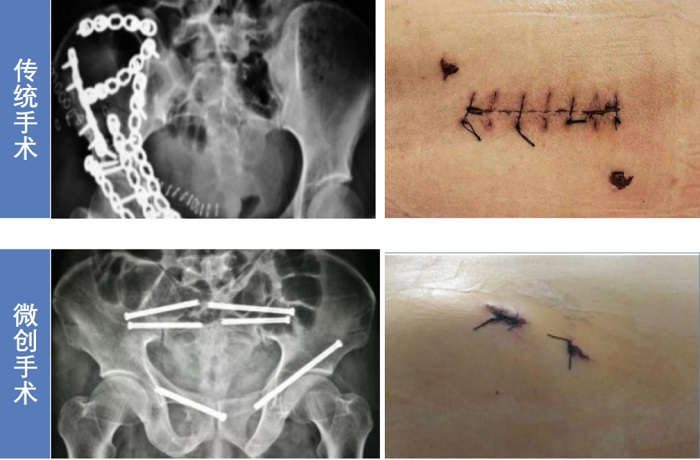 如上圖對比,相比于傳統(tǒng)手術(shù),使用骨科手術(shù)機(jī)器人(PL300B)的手術(shù)傷口由前后各30厘米的切口變成2厘米左右的小切口,手術(shù)時間縮短50%以上,出血量減少95%以上,手術(shù)并發(fā)癥發(fā)生率大大減少。